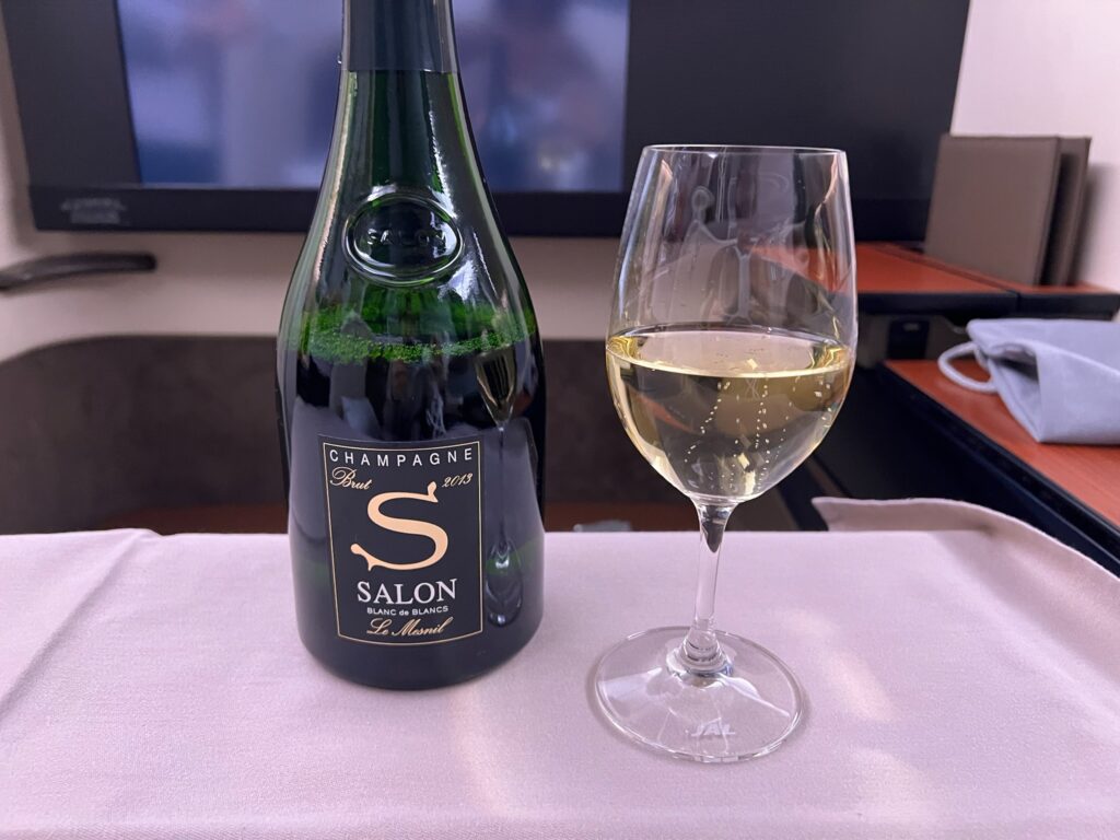 着席するとウェルカムシャンパンをいただけて……座席のあいだの仕切りをあけていただいて、乾杯!ファーストクラスの座席って基本的に個人のスペースがあまりにも広く、こうやって一緒に乾杯したりお食事を楽しんだりはしづらい(なんて贅沢な悩みなんだ……)けれど、こうやって仕切りをあけれる席がとれて、うれしかった!!